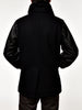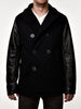 Mid-length double-breasted jacket with full leather sleeves and trim. A more styled take on the winter classic.
