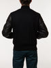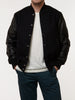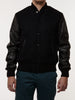 A contemporary take on the classic varsity. Slim, cropped bomber-style jacket with full leather sleeves.
